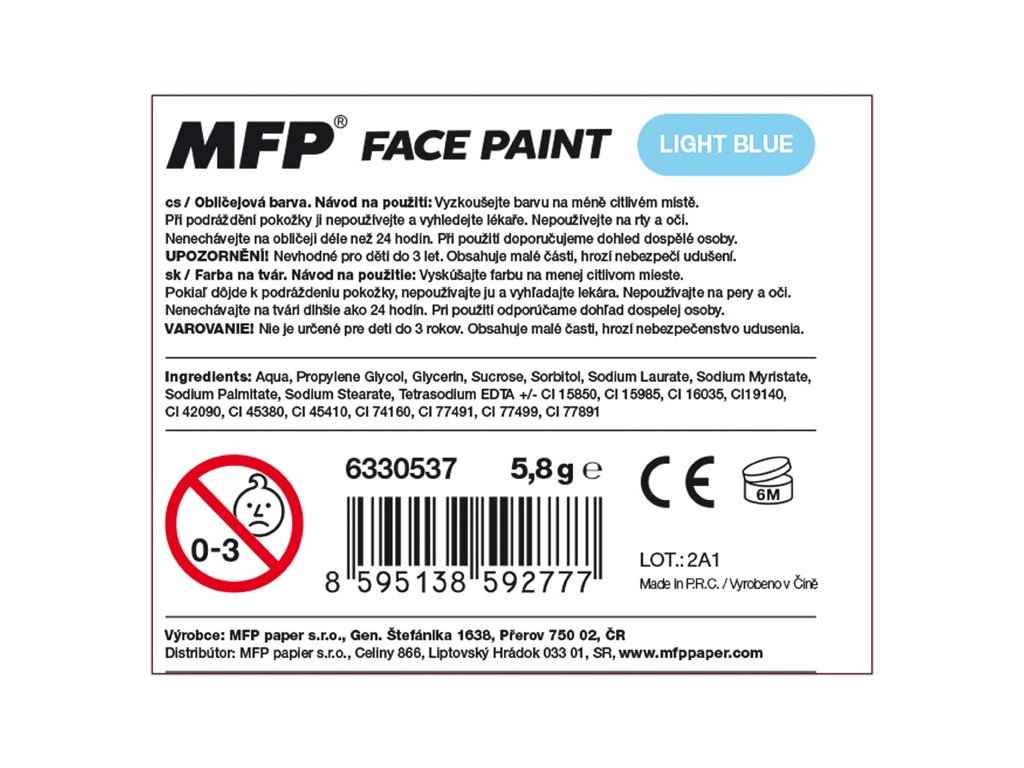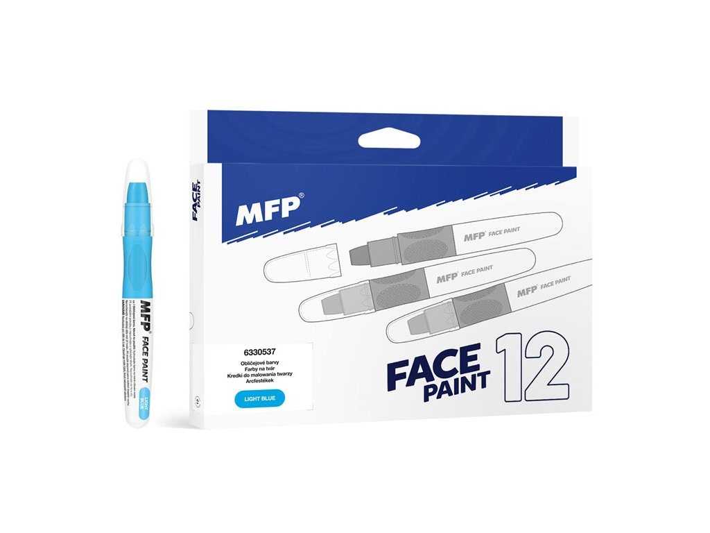 FFarba na tvár svetlo modrá, na princípe rúžu (6 g). Vďaka týmto pestrým farbám vykúzlite na tvári dieťaťa krásnu masku na karneval, párty alebo inú oslavu. Dermatologicky testované. Farba: svetlo modrá NÁVOD NA POUŽITIE: 1. Odporúčame vyskúšať farbičky na menej citlivom mieste. 2. Ak dôjde k podráždeniu pokožky, nepoužívajte a vyhľadajte lekára. 3. Nepoužívajte na pery a oči. 4. Farbičkami maľujeme na suchú pokožku. 5. Jednoducho umývateľné vodou a mydlom, farby zdravotne nezávadné. 6. Neodporúčame nechávať na tvári dlhšie ako 24 hodín. 7. Pri použití odporúčame dohľad dospelej osoby. VAROVANIE: Nevhodné pre deti do 3 rokov, nebezpečenstvo prehltnutia malých častí. Všetkých 12 ks je balených v papierovej krabičke. Uvedená cena je za 1 ks.Dodatočné parametre