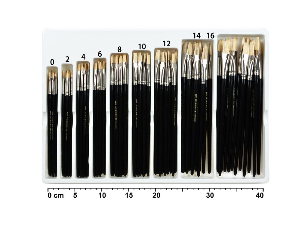 Súprava plochých štetcov 108 ks. Štetce sú vhodné na hodiny výtvarnej výchovy, ale aj na domácu kreatívnu tvorbu. Štetiny štetca sú chránené plastovou krytkou. Farba: čierna Veľkosť: mix 9 rôznych veľkostí POUŽITIE: Na maľbu vodovými a temperovými farbami, na vykresľovanie rôznych plôch na papieri, na maľovanie na kamienky. Štetce sú uložené v plastovej škatuli s priehradkami. Uvedená cena je za 1 balenie, v ktorom je 108 ks.Dodatočné parametre