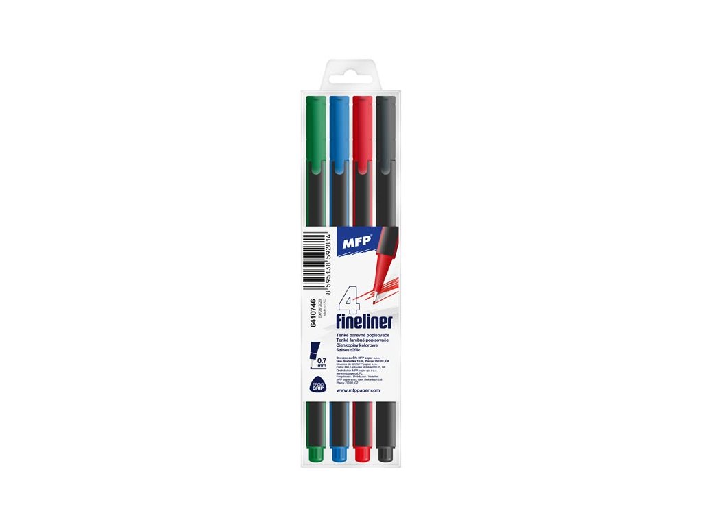 Trojhranný popisovač Fineliner – dôležitá školská a kancelárska pomôcka. Ideálna na písanie, kreslenie, zvýrazňovanie Súprava obsahuje: - 4 ks popisovačov (čierny, červený, modrý, zelený) Šírka hrotu: 0,7 mm Uvedená cena je za 1 balenie. Popisovače sú balené po 4 ks v plastovom obale so závesom.Dodatočné parametre