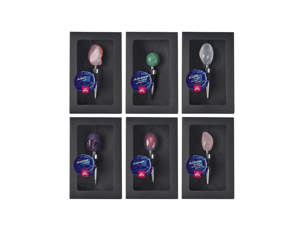 Elegantný displej obsahujúci 12 štýlových zátok na víno z kolekcie Gifty, ktoré spájajú funkčnosť a estetiku. Každá zátka je zdobená prírodným polodrahokamom, ako je achát, ametyst, karneol, ruženín, avanturín a krištáľ, čo dodáva každej fľaši vína jedinečný nádych luxusu a originality. Display zahŕňa šesť rôznych typov zátok, pričom každý variant je zastúpený dvakrát, čo zaisťuje rozmanitosť a širší výber. Uzáver každej zátky je zhotovený z odolného pochrómovaného kovu, ktorý kombinuje štýl a dlhú životnosť. Tesnenie z termoplastickej gumy pevne priľne k hrdlu fľaše, spoľahlivo uzatvára obsah a uchováva čerstvosť aj arómu vína. Skvelý darček pre každú príležitosť!