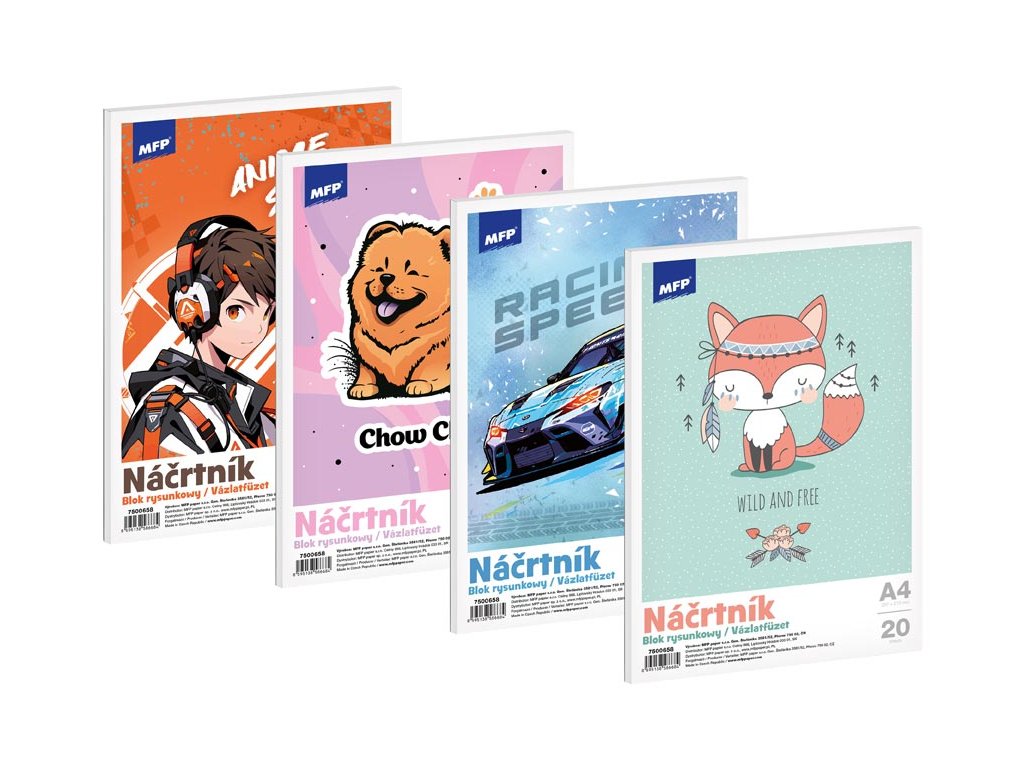Náčrtník s čistými bielymi listami – (bez linajok). Urobte si pohodovú chvíľku s deťmi a načrtnite si nejaký obrázok. Máme pre vás širokú škálu poznámkových blokov, trhacích blokov, záznamových kníh a to dokonca v rôznych veľkostiach. Nezabudnite si u nás nakúpiť aj voskovky, vodové farby a štetce, ceruzky a pastelky. Titulná strana je opatrená 4 motívmi (motýľ, smajlík, fomula, mix). POUŽITIE: Na maľovanie ceruzkou, pastelkami i uhlíkom. Rozmer: A4 Počet listov: 20 listov Gramáž papiera: 70 g Uvedená cena je za 1 ksDodatočné parametre