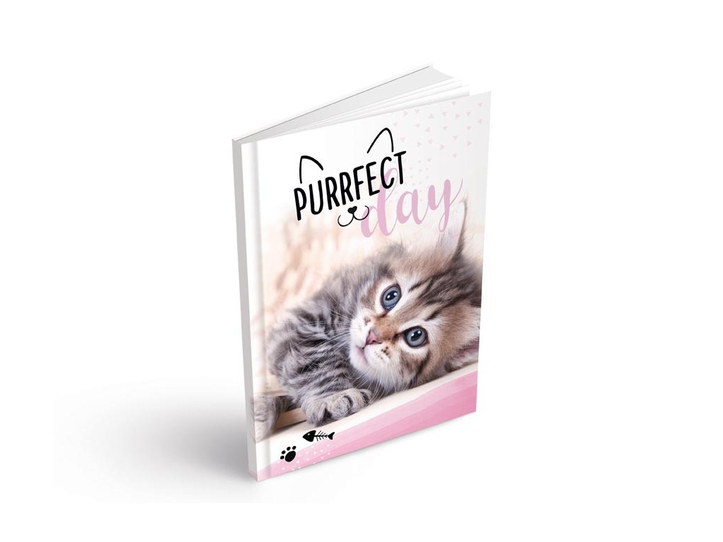 Záznamová kniha MFP s linajkami. Dosky sú z pevného lepeného kartónu s laminovaním. Na titulnej strane je spokojné mačiatko. Tieto bloky sú opatrené väzbou V8, ktorá patrí medzi najprepracovanejšie a najpevnejšie väzby. Počet listov: 100 Formát: A5 Motív: mačiatko Text: purrfect day Uvedená cena je za 1 ksDodatočné parametre
