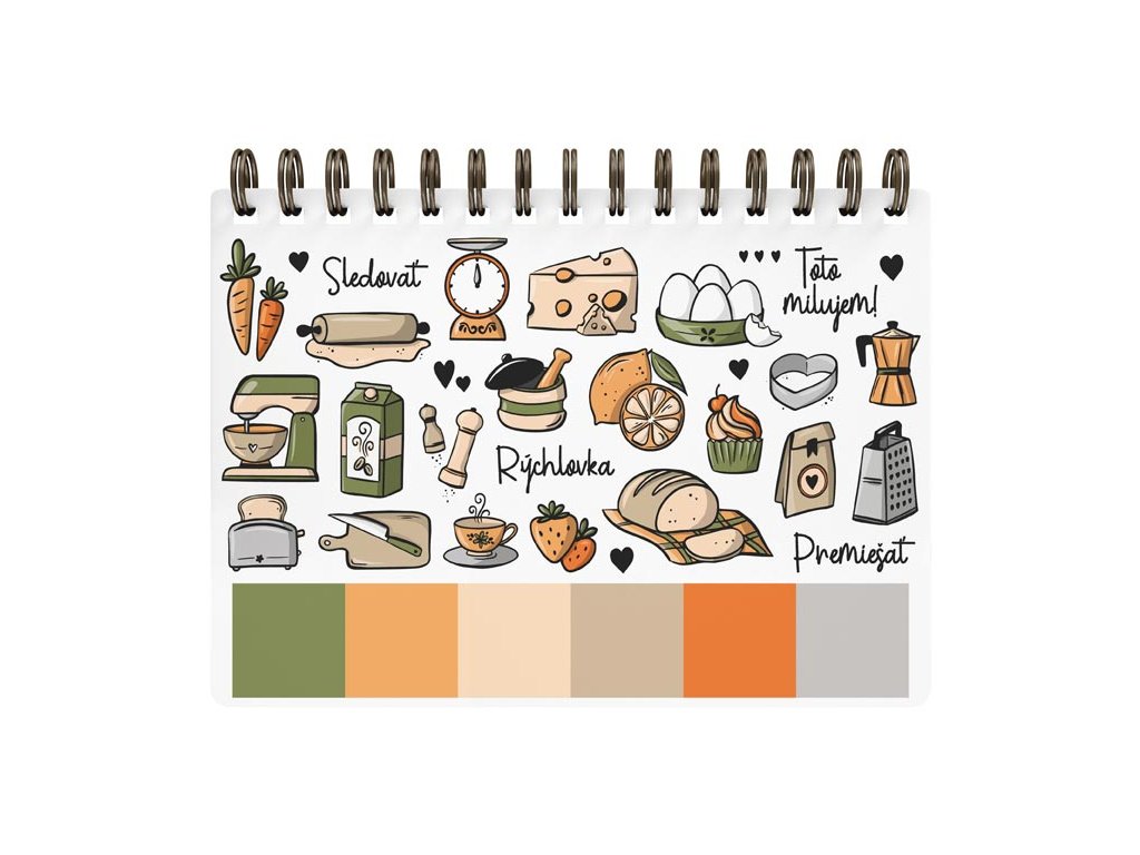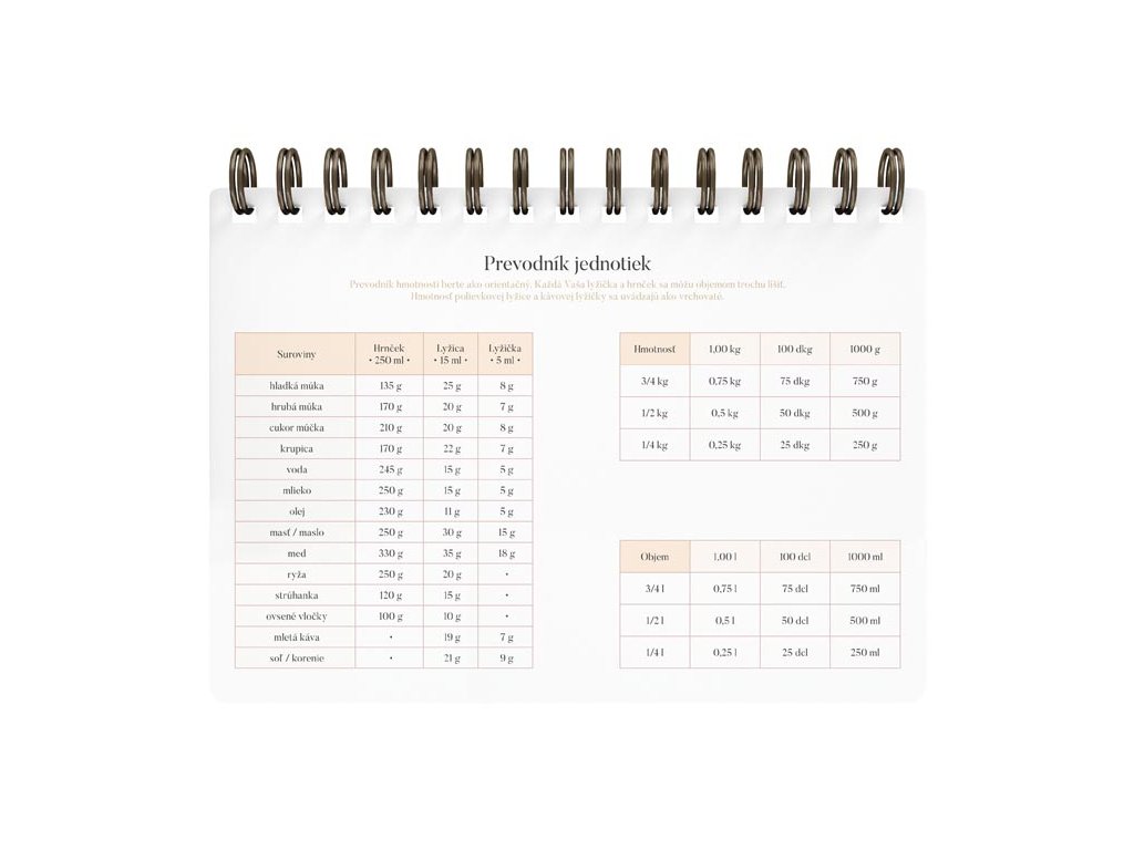 Kniha na recepty s vareškou, s množstvom praktických vychytávok. Knihu sme schválne situovali na šírku. Pri práci v kuchyni si ju môžete postaviť ako kalendár. Nezaberie tým pádom toľko miesta, ako keby bola položená na pracovnej ploche, a tak sa aj menej zašpiní. Navyše kuchárok s formátom na šírku je rozhodne menej. A kto by nechcel byť originálny? Kniha je opatrená gumičkou proti samovoľnému otvoreniu. Vnútri nájdete: - 2 archy samolepiek - 148 stránok pre vaše recepty - prevodník jednotiek - pár tipov čo s niektorými zvyškami z kuchyne - register receptov - miesto pre vaše poznámky a nápady - pri každom recepte možnosť variácií jedál (vegánske, bez lepku atď.) - papierové vrecko na zadnej strane dosiek Počet listov: 80 Väzba: krúžková Rozmer: 220 x 158 mm Uvedená cena je za 1 ks.Dodatočné parametre