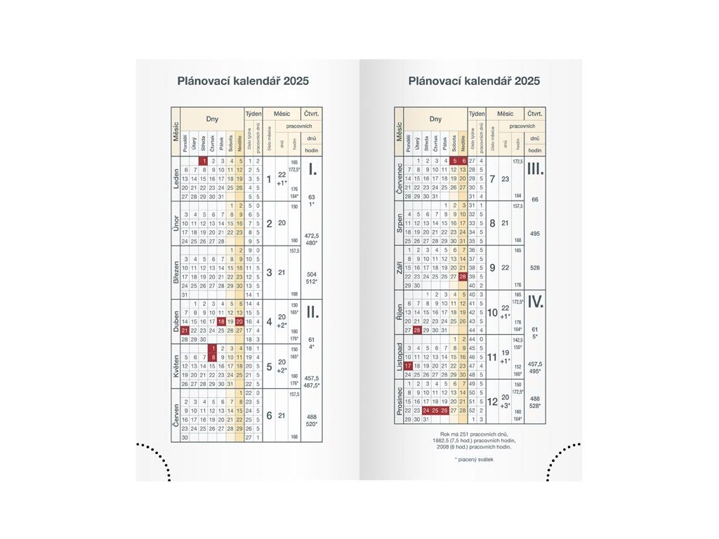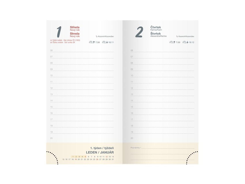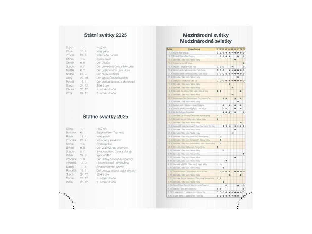 Denný diár na rok 2025, ktorý vás očarí svojou eleganciou a jemným dizajnom. Obálka je vyrobená z lesklého lamina, čo jej dodáva luxusný vzhľad a je príjemná na dotyk. Tento diár je nielen praktickým pomocníkom pre každodennú organizáciu vášho času, ale aj štýlovým doplnkom. Výhodou je aj skladný rozmer, ktorý zároveň poskytuje dostatok miesta na poznámky. DIÁR OBSAHUJE: - priestor pre osobné údaje: - ročný prehľad roka - plánovací kalendár - štvrťročný plánovací kalendár - abecedný zoznam mien - štátne sviatky - medzinárodné sviatky - 7 strán pre poznámky - mapy - menné kalendárium - číslovanie týždňov - štátne sviatky a významné dni - východy a západy Slnka - fáza mesiaca - letný a zimný čas - znamenie - prehľad dvoch mesiacov Väzba: šitá V8 Rozsah: 336 strán Rozmer: 90 x 170 mm Kalendárium: československé denné Povrchy a spracovanie obálky: lesklé lamino Uvedená cena je za 1 ks.Dodatočné parametre