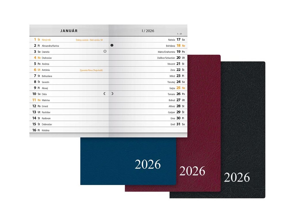 Dokonalý prehľad! Mesačný diár 2026 je ideálnou voľbou pre každého, kto potrebuje mať celý mesiac prehľadne na očiach. Každý mesiac je zobrazený na jednej dvojstrane, čo umožňuje rýchly pohľad na všetky dôležité udalosti. Diár ponúka dostatok priestoru na zapisovanie, plánovanie a poznámky k jednotlivým dňom. PVC obal v praktických farbách (modrá, bordová, čierna) chráni diár pred poškodením. Vďaka kompaktným rozmerom sa ľahko zmestí do tašky alebo nájde miesto na stole – vždy poruke, keď potrebujete rýchly prehľad. DIÁR OBSAHUJE: - ročný prehľad - medzinárodné sviatky - abecedný zoznam mien - stranu na poznámky - menné kalendárium - číslovanie týždňov - štátne sviatky a významné dni - pracovné dni a hodiny - fázy mesiaca - letný a zimný čas Počet strán: 32 Väzba: zošitová V1 Kalendárium: mesačné Rozmer: 75 × 115 mm Farby: modrá, bordová, čierna Povrch a spracovanie obalu: PVC Dodávame v mixe farieb podľa skladovej dostupnosti Uvedená cena je za 1 ks.Dodatočné parametre