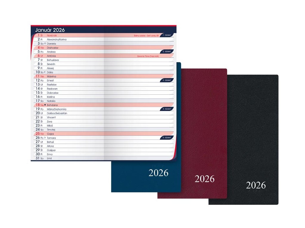 Rýchly prehľad! Mesačný diár 2026 ponúka ideálny spôsob, ako mať celý mesiac prehľadne na jednom mieste. Každý mesiac je zobrazený na dvojstrane, čo umožňuje rýchly prehľad a dostatok miesta na poznámky, úlohy a zápisky. PVC obálka v praktických farbách (modrá, červená, čierna) zabezpečuje dlhú životnosť a odolnosť voči každodennému používaniu. Vďaka kompaktnému formátu je tento diár ideálny na rýchle záznamy na cestách, v práci aj doma. DIÁR OBSAHUJE: - plánovací kalendár - priestor na ordinačné a úradné hodiny - ročný prehľad roka - medzinárodné sviatky - abecedný zoznam mien - 3 strany na poznámky - mapa SR - menné kalendárium - číslovanie týždňov - štátne sviatky a významné dni - pracovné dni a hodiny - fázy mesiaca - letný a zimný čas Počet strán: 48 Väzba: zošitová V1 Kalendárium: mesačné Rozmer: 80 × 150 mm Farba: modrá, bordová, čierna Povrch a spracovanie obálky: PVC Dodávame v mixe 3 farieb podľa skladovej dostupnosti. Uvedená cena je za 1 ks.Dodatočné parametre