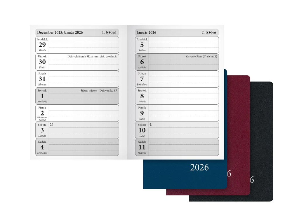 Týždeň čo týždeň s prehľadom! Týždenný diár na rok 2026 vám poskytne prehľad o celom týždni, čo uľahčí plánovanie pracovných povinností, stretnutí aj voľného času. Vďaka prehľadnému usporiadaniu budete mať všetky úlohy a termíny vždy pod kontrolou. Povrch z PVC je odolný a zaručuje, že diár vydrží aj každodenné používanie. Vďaka kompaktným rozmerom sa ľahko prispôsobí vášmu životnému štýlu a pohodlne sa zmestí tam, kde ho potrebujete. DIÁR OBSAHUJE: - ročný prehľad roka - štátne sviatky a významné dni - plánovací kalendár - 2 strany na poznámky - abecedný zoznam mien - menné kalendárium - cudzie jednotky a meny - číslovanie týždňov - fázy mesiaca - letný a zimný čas Počet strán: 72 Väzba: zošitová V1 Rozmer: 90 × 125 mm Kalendárium: týždenné Farba: modrá, bordová, čierna Povrch a spracovanie obálky: PVC Dodávame v mixe 3 farieb podľa skladovej dostupnosti. Uvedená cena je za 1 ks.Dodatočné parametre
