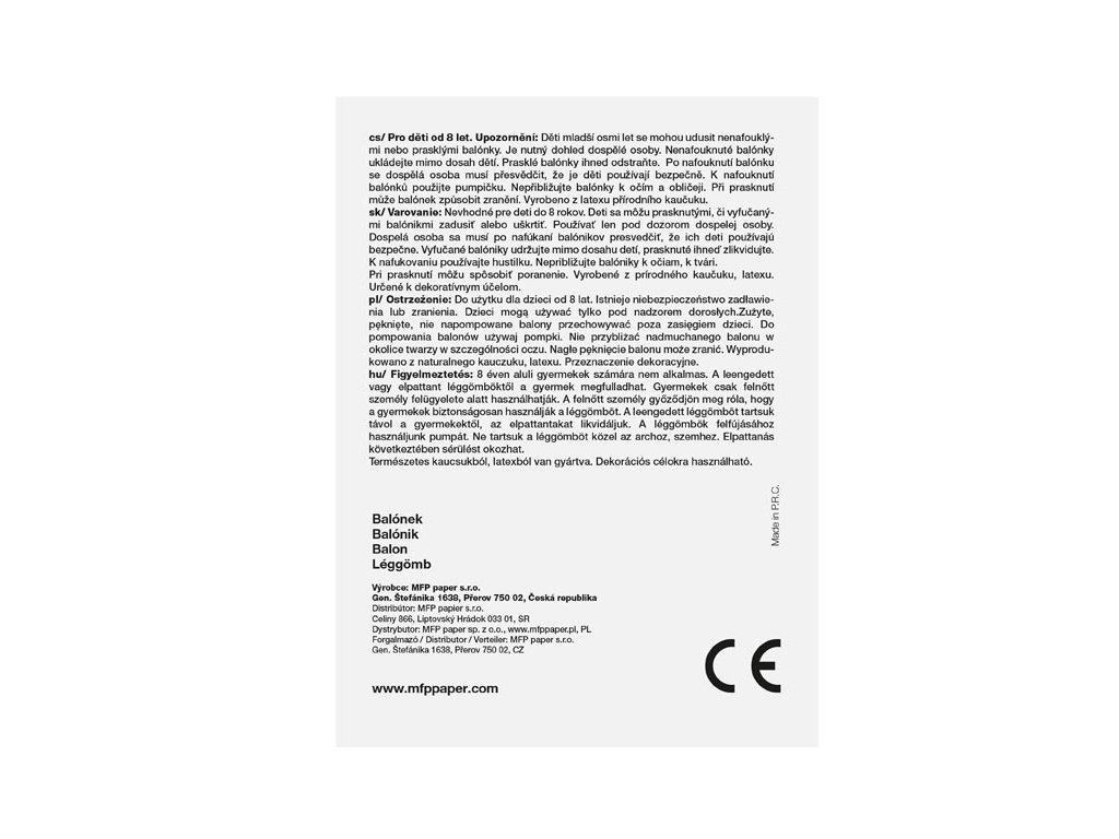 Nafukovací balónik M štandard 2,8 g - 30 cm, mix. Balóniky sú obľúbeným dekoračným doplnkom na narodeninovej oslave či inej významnej udalosti. Nafukovacie balóniky nesmú chýbať na žiadnej oslave, dodajú tú pravú atmosféru do celej miestnosti a narodeninová párty môže začať! VAROVANIE: Nevhodné pre deti do 8 rokov. Deti sa môžu prasknutými, či vyfučanými balónikmi zadusiť alebo uškrtiť. Používať len pod dozorom dospelej osoby. Dospelá osoba sa musí po nafúkaní balónikov presvedčiť, že ich deti používajú bezpečne. Vyfučané balóniky udržujte mimo dosahu detí, prasknuté ihneď zlikvidujte. K nafukovaniu používajte hustilku. Nepribližujte balóniky k očiam, k tvári. Pri prasknutí môžu spôsobiť poranenie. Vyrobené z prírodného kaučuku, latexu. Určené k dekoratívnym účelom. Dodávame v sáčku iba po 100 ks. Uvedená cena je za 1 ks.Dodatočné parametre