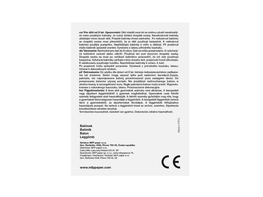Nafukovací balónik M štandard 2,8 g - 30 cm, mix. Balóniky sú obľúbeným dekoračným doplnkom na narodeninovej oslave či inej významnej udalosti. Nafukovacie balóniky nesmú chýbať na žiadnej oslave, dodajú tú pravú atmosféru do celej miestnosti a narodeninová párty môže začať! BALENIE OBSAHUJE: - 100 ks bielych balónikov VAROVANIE: Vhodné pre deti od 8 rokov. Deti sa môžu prasknutými či vyfúknutými balónikmi zadusiť alebo uškrtiť. Používajte iba pod dozorom dospelej osoby. Dospelá osoba sa po nafúknutí balónika musí presvedčiť, že ho deti používajú bezpečne. Vyfúknuté balóniky udržujte mimo dosahu detí a prasknuté ihneď zlikvidujte. Na nafukovanie balónikov použite pumpičku. Nepribližujte balóniky k očiam a tvári. Pri prasknutí môže balónik spôsobiť zranenie. Vyrobené z prírodného kaučuku, latexu. Určené na dekoratívne účely. Nebezpečenstvo vdýchnutia a prehltnutia malých častíc. Dodávame iba v sáčku so závesom po 100 ks. Uvedená cena je za 1 ks.Dodatočné parametre