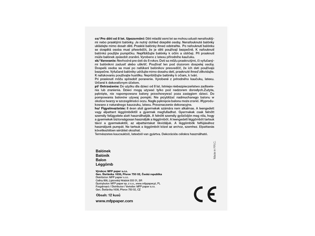 Nafukovací balónik M štandard 2,8 g - 30 cm, mix. Balóniky sú obľúbeným dekoračným doplnkom na narodeninovej oslave či inej významnej udalosti. Nafukovacie balóniky nesmú chýbať na žiadnej oslave, dodajú tú pravú atmosféru do celej miestnosti a narodeninová párty môže začať! BALENIE OBSAHUJE: - 12 ks farebných balónikov - (červená, modrá, žltá, ružová, zelená, oranžová) VAROVANIE: Nevhodné pre deti do 8 rokov. Deti sa môžu prasknutými, či vyfučanými balónikmi zadusiť alebo uškrtiť. Používať len pod dozorom dospelej osoby. Dospelá osoba sa musí po nafúkaní balónikov presvedčiť, že ich deti používajú bezpečne. Vyfučané balóniky udržujte mimo dosahu detí, prasknuté ihneď zlikvidujte. K nafukovaniu používajte hustilku. Nepribližujte balóniky k očiam, k tvári. Pri prasknutí môžu spôsobiť poranenie. Vyrobené z prírodného kaučuku, latexu. Určené k dekoratívnym účelom. Dodávame v sáčku so závesom. Uvedená cena je za 1 balenie po 12 ks.Dodatočné parametre