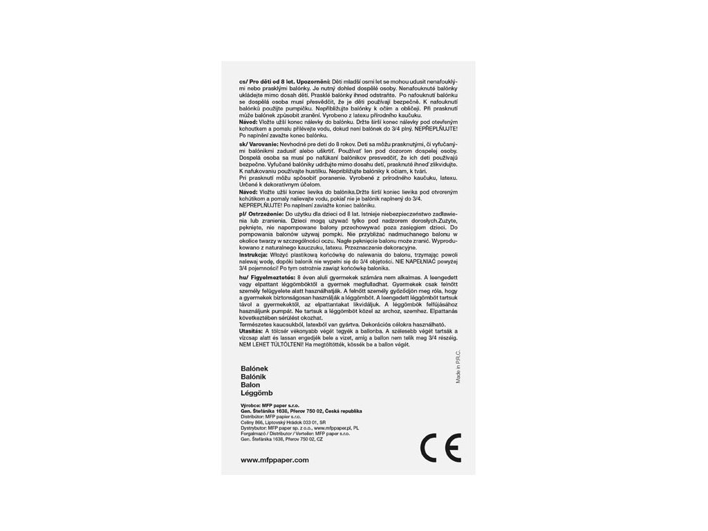 Vodné bomby sú nafukovacie balóniky, ktoré sa napúšťajú vodou a slúžia ako munícia v horúcich dňoch. BALENIE OBSAHUJE: - 100 ks neónových vodných balónikov - lievik VAROVANIE: Vhodné pre deti od 8 rokov. Deti sa môžu prasknutými či vyfúknutými balónikmi zadusiť alebo uškrtiť. Používajte iba pod dozorom dospelej osoby. Dospelá osoba sa po nafúknutí balónika musí presvedčiť, že ho deti používajú bezpečne. Vyfúknuté balóniky udržujte mimo dosahu detí a prasknuté ihneď zlikvidujte. Na nafukovanie balónikov použite pumpičku. Nepribližujte balóniky k očiam a tvári. Pri prasknutí môže balónik spôsobiť zranenie. Vyrobené z prírodného kaučuku, latexu. Určené na dekoratívne účely. Nebezpečenstvo vdýchnutia a prehltnutia malých častíc. Dodávame iba v sáčku so závesom po 100 ks. Uvedená cena je za 1 balenie.Dodatočné parametre