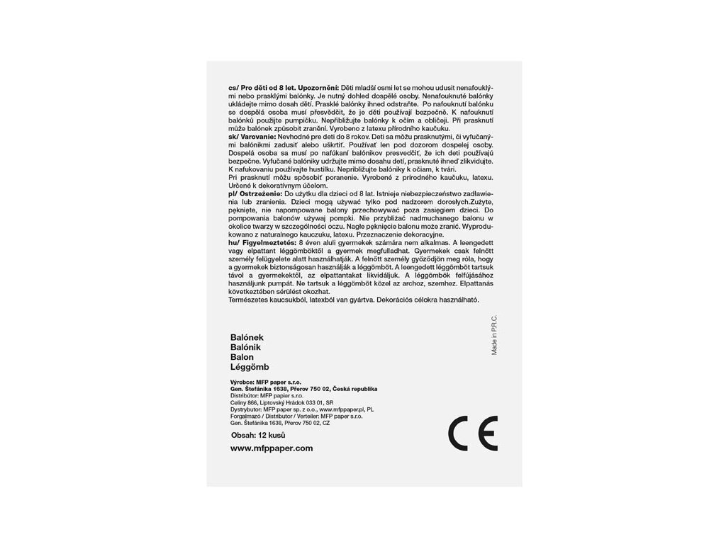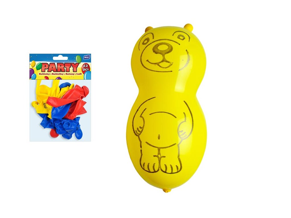 Nafukovací balónik v tvare medvedíka. Dodávame v mixe farieb. Uvedená cena je za jedno balenie, v ktorom je 12 balónikov. Varovanie: Vhodné pre deti od 8 rokov. Deti sa môžu prasknutými alebo spustenými balónikmi zadusiť, uškrtiť. Používajte len pod dozorom dospelej osoby. Dospelá osoba sa po nafúknutí balónika musí presvedčiť, že ho deti používajú bezpečne. Spustené balóniky udržiavajte mimo dosahu detí, prasknuté ihneď zlikvidujte. K nafukovaniu používajte hustilku. Nepribližujte k očiam a k tvári. Pri prasknutí môže balónik spôsobiť zranenie. Je vyrobený z prírodného kaučuku, latexu. Je určený na dekoratívne ciele. Nebezpečenstvo vdýchnutia a prehltnutia drobných častíc.Dodatočné parametre