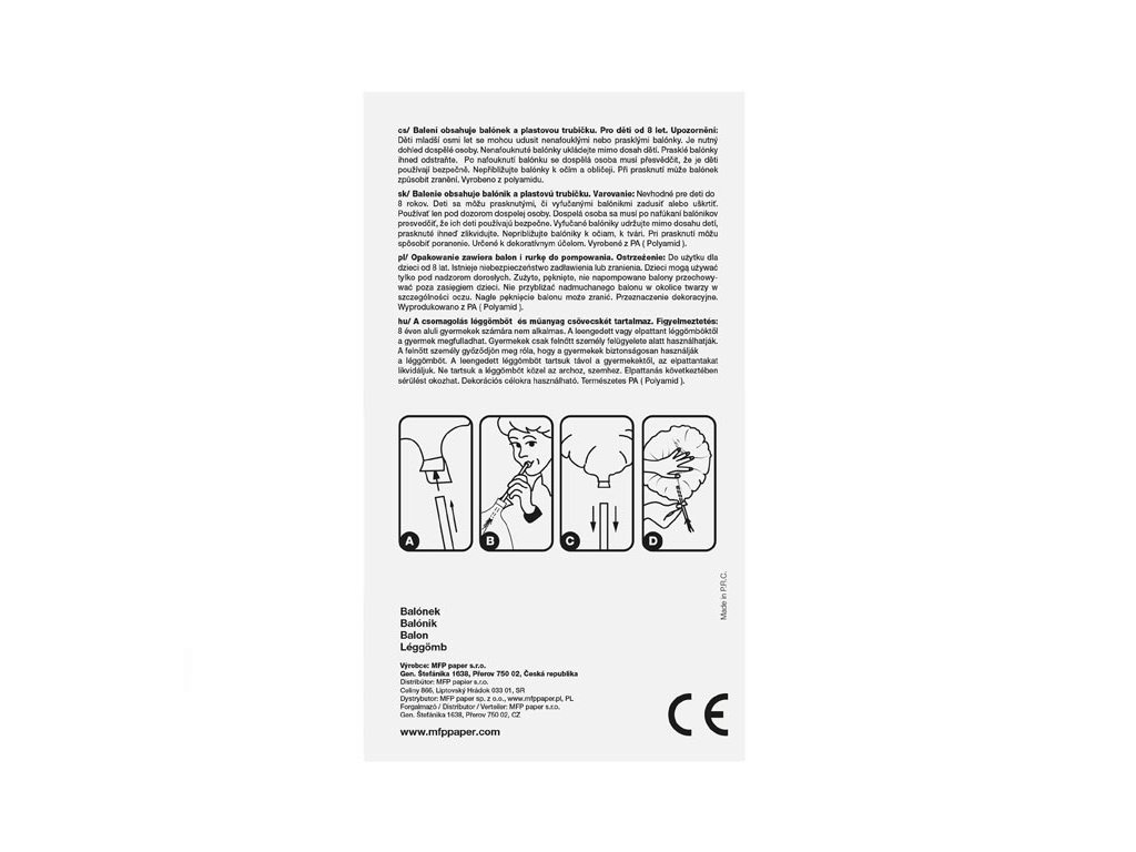 Nafukovací fóliový balónik v tvare č. 2. Hitom posledných rokov sú obľúbené balóniky v tvare číslic, ktoré oživia celú narodeninovú oslavu a určite potešia oslávenca. Narodeninová oslava sa môže začať! Balónik je vyrobený zo striebornej fólie. Na hornej strane balónika sú očká na priviazanie. Výška balónika: 75 cm BALENIE OBSAHUJE: -balónik -brko na nafúknutie -návod NÁVOD K NAFÚKNUTIU BLÓNIKA: 1. vybaľte balónik a plastové brko z obalu 2. zasuňte brko do otvoru na nafukovanie, ktorý je umiestnený na spodnej strane balónika 3. fúkaním cez brko nafúknete balónik 4. opatrne vytiahnite brko z balónika (systém je navrhnutý tak, že nemusíte ústie balónika zaväzovať) 5. k vyfúknutiu balónika zasuňte brko opäť do otvoru a tlačte na balónik VAROVANIE: Vhodné pre deti od 8 rokov. Deti sa môžu prasknutými či vyfúkanými balónikmi zadusiť alebo uškrtiť. Používajte ich len pod dozorom dospelej osoby. Dospelá osoba sa po nafúknutí balónu musí presvedčiť, že ho deti používajú bezpečne. Vyfúknuté balóny udržiavajte mimo dosahu detí a prasknuté ihneď zlikvidujte. K nafukovaniu balónikov používajte hustilku. Nepribližujte balóny k očiam a k tvári. Pri prasknutí môže balónik spôsobiť zranenie. Vyrobené sú z prírodného kaučuku, latexu. Určené k dekoratívnym účelom. Nebezpečenstvo vdýchnutia a prehltnutia malých častí. Uvedená cena je za 1 ks. Dodávame vo vrecku.Dodatočné parametre