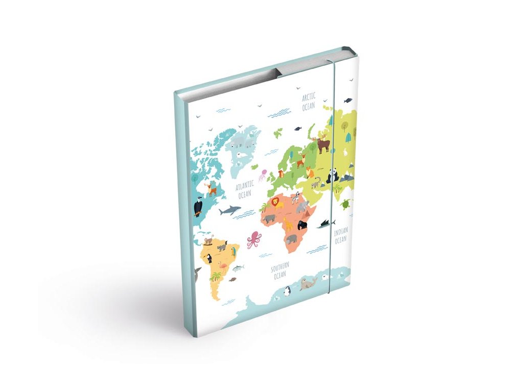 Školské dosky na zošity vo veľkosti A4 s motívom mapy sveta. Sú nevyhnutnou súčasťou výbavy každého školáka. Vďaka školským doskám budú všetky zošity a učebnice pohromade a nepoškodené. Tieto dosky na zošity sú vybavené gumičkou, ktorá zabraňuje ich samovoľnému otváraniu. Heft box je vyrobený z kvalitného lepenkového kartónu potiahnutého laminom. Z tohto dôvodu sa veľmi ľahko udržiava. Motív: mapa sveta Materiál: lepenkový kartón s laminom Uvedená cena je za 1 ks.Dodatočné parametre