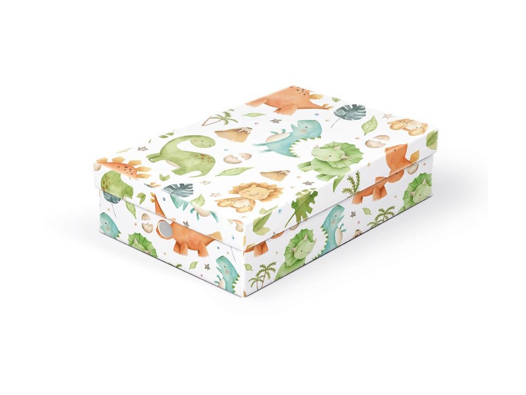Školská krabica z kartónu, s motívom dinosaurov. Vhodná na ukladanie nevyhnutných pomôcok na výtvarnú výchovu alebo iných školských potrieb. Do krabice sa zmestí formát A4. Materiál: kartón Motív: dinosaury Rozmer: 330 x 225 x 80 mm Uvedená cena je za 1 ks.Dodatočné parametre