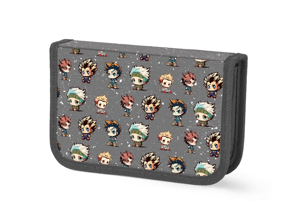 Školský jednoposchodový nevybavený peračník s dvoma chlopňami v tmavo šedej farbe s motívom anime maskotov. Chlopne majú na vonkajšej strane praktické priehľadné vrecko na rozvrh. Peračník obsahuje 23 pútok na pastelky, ceruzky a perá a 3 väčšie pútka napr. na nožnice, gumu, strúhadlo alebo pravítko. Veľmi ľahko sa uzatvára vďaka veľkému zipsu. Bezpochyby je nevyhnutnou súčasťou vybavenia každého školáka. - nie je vybavený - zdravotne nezávadný a neobsahuje toxické látky ODPORÚČANIA: - čistiť iba navlhčenou handričkou vo vode s trochou saponátu Uvedená cena je za 1 ks.Dodatočné parametre