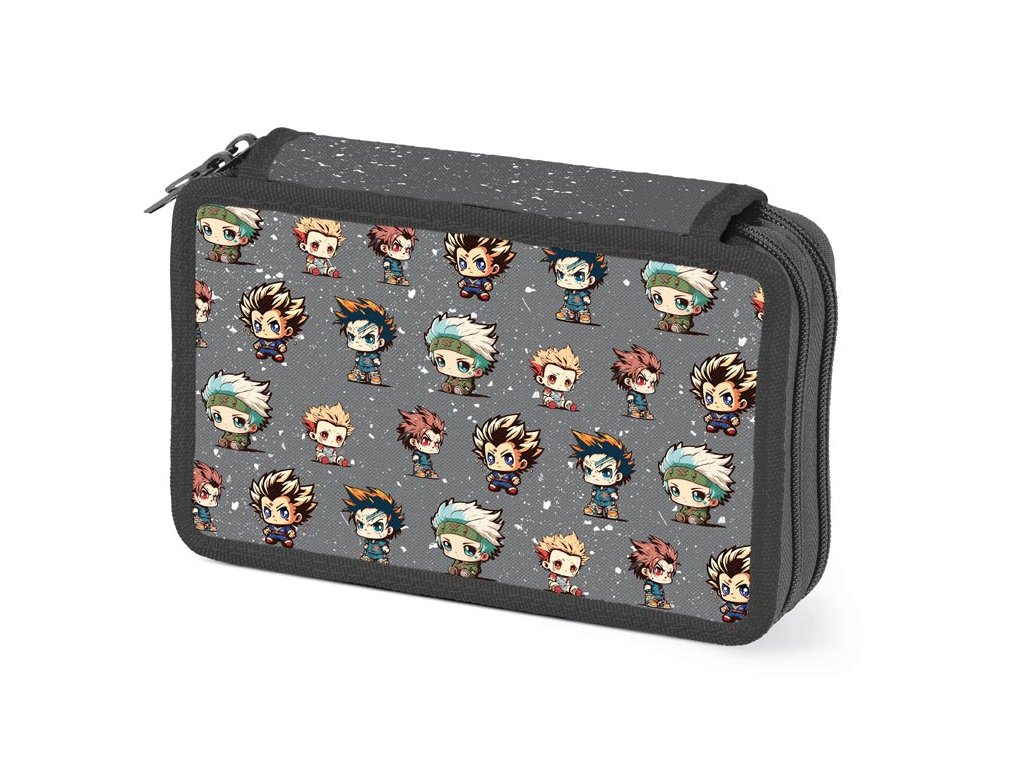 Školský dvojposchodový nevybavený peračník v tmavo šedej farbe s motívom anime maskotov. Peračník obsahuje 24 pútok na písacie potreby a 3 väčšie napr. na pravítko, strúhadlo, gumu alebo nožnice. Veľmi ľahko sa uzatvára vďaka veľkému zipsu a je z kvalitných a odolných materiálov. Bezpochyby je nevyhnutnou súčasťou vybavenia každého školáka. - nie je vybavený - zdravotne nezávadný a neobsahuje toxické látky ODPORÚČANIA: - čistiť iba navlhčenou handričkou vo vode s trochou saponátu Uvedená cena je za 1 ks.Dodatočné parametre