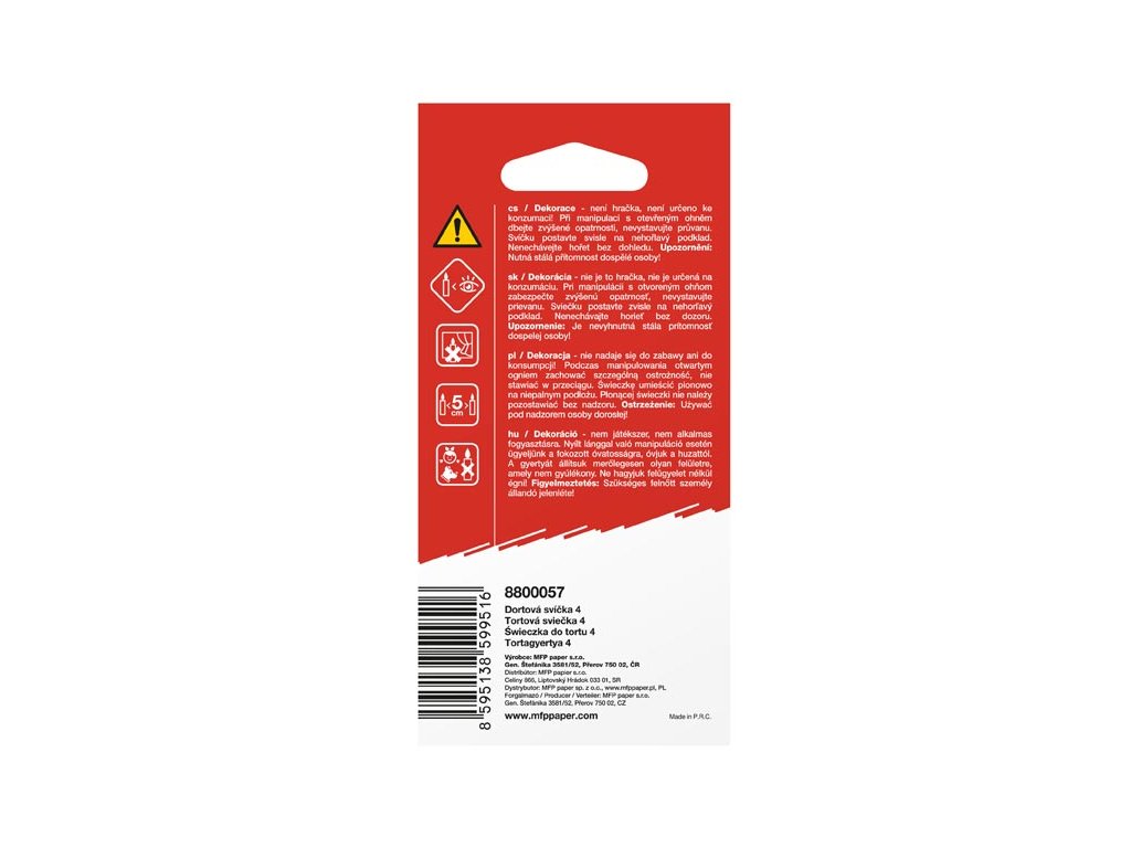 Tortová sviečka v tvare čísla 4. Sviečka má duhový potisk z prednej strany. Kúpte oslávencovi tortové sviečky, ktoré dozdobia už tak dokonalú tortu a splnia oslávencovi jeho tajné prianie! VAROVANIE: Slúži ako dekorácia, nie je hračka, nie je určené na konzumáciu! Pri manipulácii s otvoreným ohňom dbajte na zvýšenú opatrnosť, nevystavujte prievanu. Sviečku postavte zvisle na nehorľavý podklad. Nenechávajte horieť bez dohľadu. Nutná stála prítomnosť dospelej osoby! Dodávame v plastovom obale so závesom. Uvedená cena je za 1 ks.Dodatočné parametre