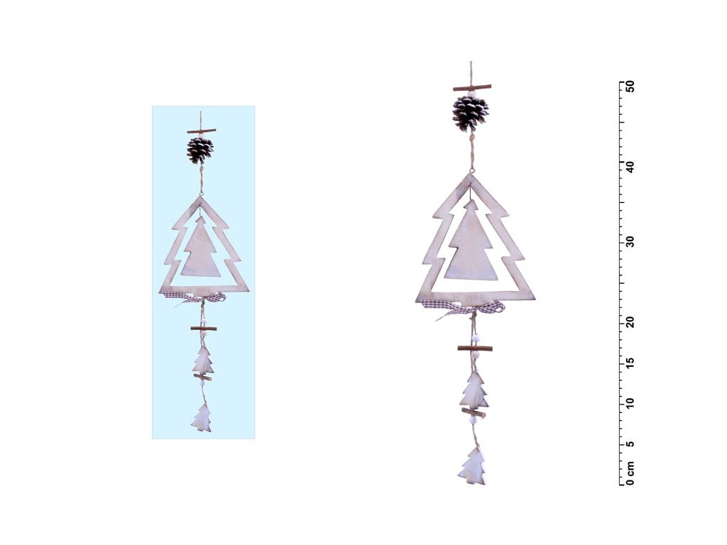 Vianočná drevená dekorácia stromček so závesom. Vianočná ozdoba je opatrená korálkami, šiškou a povrázkom na zavesenie. Vhodný na zavesenie do dverí, do okna alebo na stenu. Materiál: drevo Veľkosť: 500 mm Dodávame v sáčku so závesom. Uvedená cena je za 1 ks.Dodatočné parametre