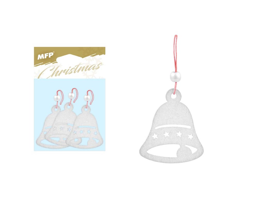 Drevený vianočný zvonček so šnúrkou na zavesenie. Táto vianočná dekorácia je striebornej farby. Môžete ju použiť na ozdobu vianočného stromčeka, zavesiť na dvere, na okno, alebo inak skrášliť váš byt. Balené vo vrecúšku so závesom. Balenie obsahuje 3 kusy.Dodatočné parametre