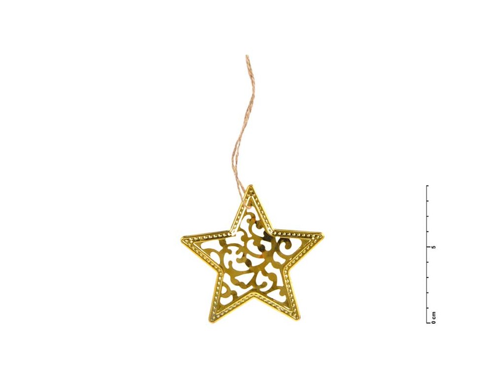 Vianočná kovová dekorácia hviezda v zlatej farbe so závesom. Vianoce sú sviatkami pohody a pokoja, a preto je potrebné sa na ne poriadne pripraviť. Vyzdobte si domov touto krásnou kovovou dekoráciou, ktorá Vám navodí pocit prichádzajúcich Vianoc. Táto vianočná ozdoba je opatrená očkom a povrázkom na zavesenie. Môžete použiť na ozdobenie vianočného stromčeka, zavesiť na dvere, okno a skrášliť tak Vaše bývanie. Farba: zlatá Veľkosť: 90 mm Uvedená cena je za 1 ks.Dodatočné parametre