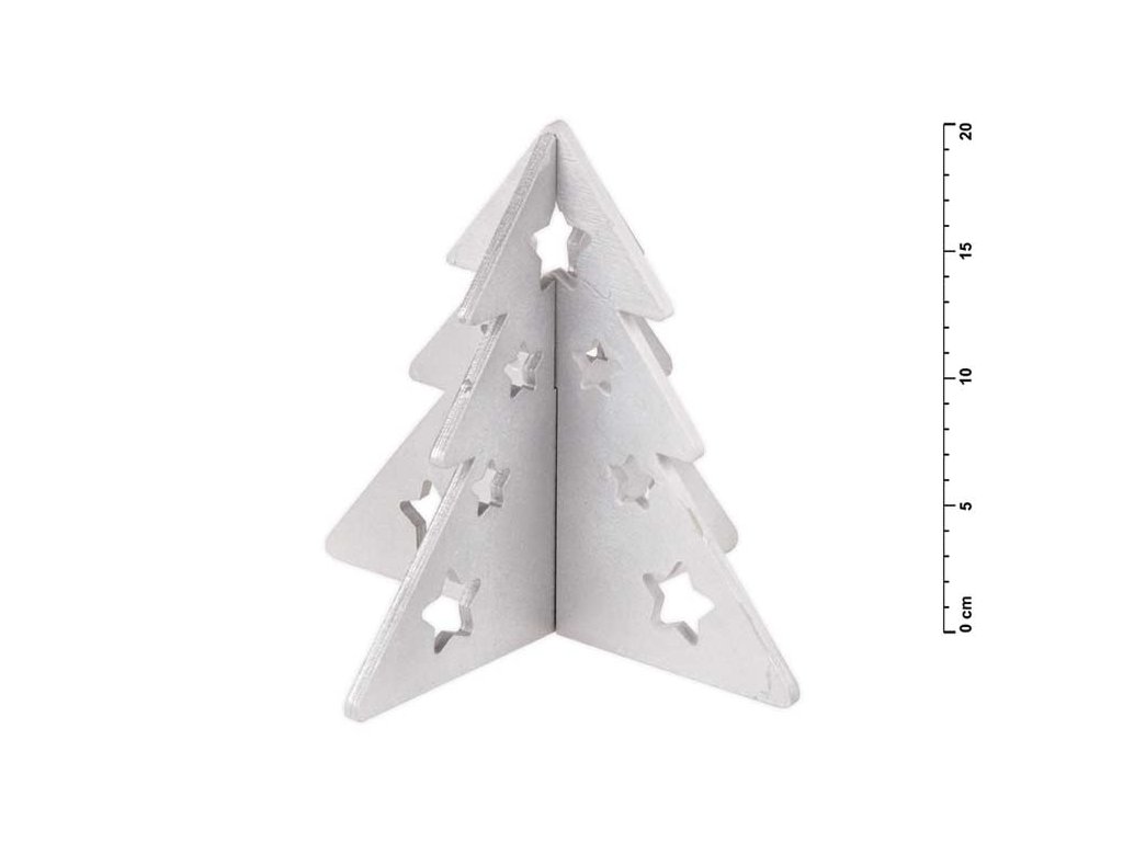 Vianočná drevená dekorácia skladací stromček striebornej farby. Táto vianočná ozdoba sa skladá z dvoch dielov, ktoré sa jednoducho zasunú do seba. Výška stromčeka: 20 cm Uvedená cena je za 1 ks.Dodatočné parametre
