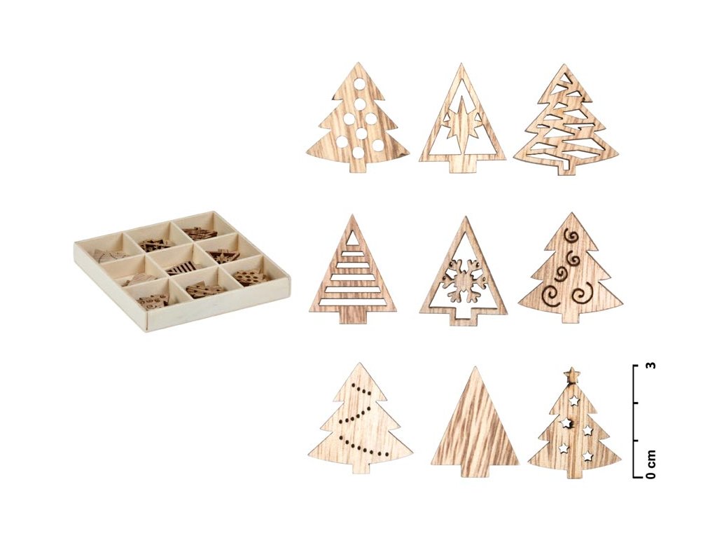 Vianočná dekorácia – 27 kúskov vianočných ozdôb v tvare stromčeka o veľkosti 30 mm. Ozdoby sú vyrezané z preglejky a uložené v darčekovej škatuľke. Rozmery ozdôb: 30 x 27 x 2 mm Rozmery škatuľky: 104 x 104 x 15 mmDodatočné parametre