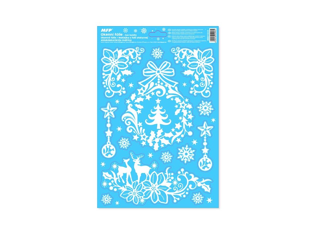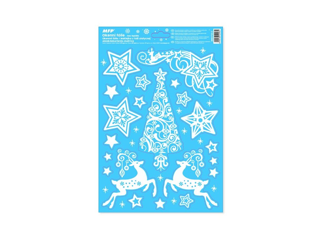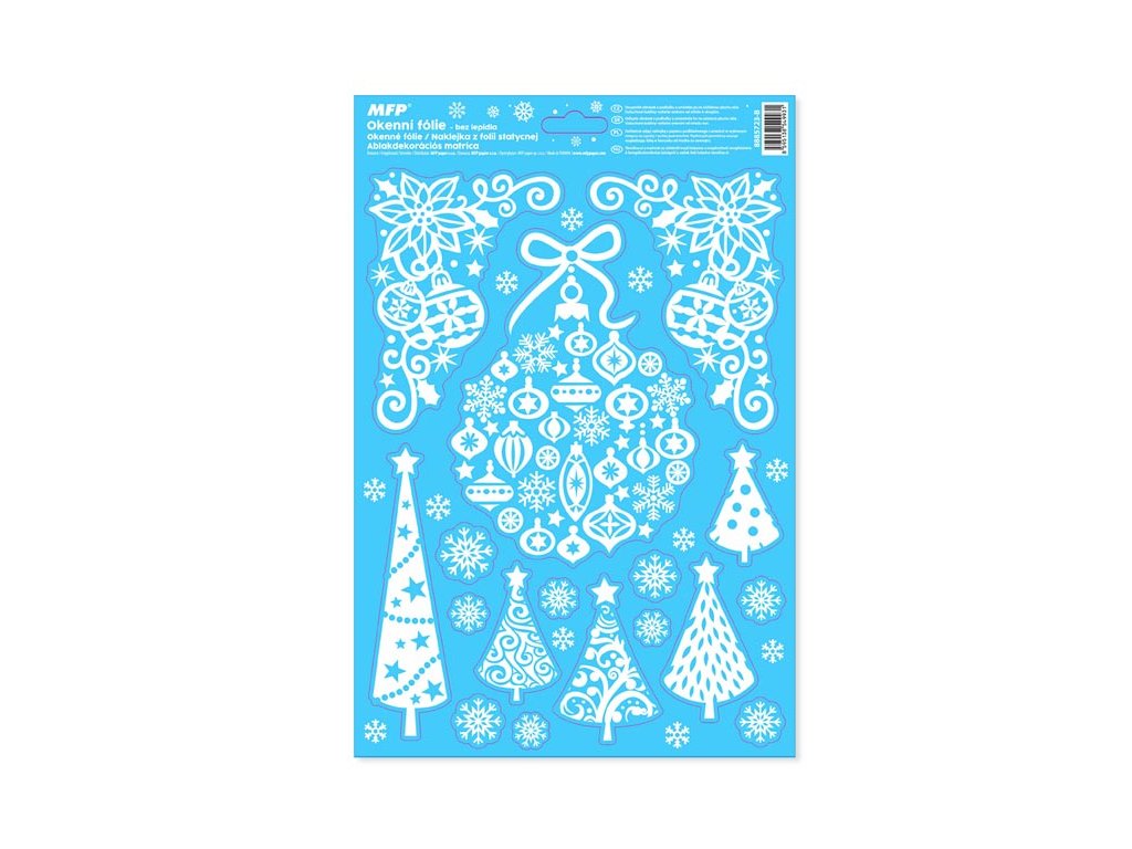 Adhézna okenná fólia bez lepidla s vianočnými motívmi (vločky, stromčeky, hviezdy). Vyzdobte si okno týmito krásnymi samolepkami na okno. Vytvoria vám čarovnú atmosféru domova. NÁVOD: 1. Odlepte z podložky obrázok a umiestnite ho na čisté, prípadne navlhčené sklo tou stranou, ktorá bola na podložke. 2. Obrázok elektrostaticky priľne. 3. Fólia sa dá ľahko odlepiť a premiestniť. Dodávame v mixe po 4 ks podľa skladových zásob. Uvedená cena je za 1 ks.Dodatočné parametre