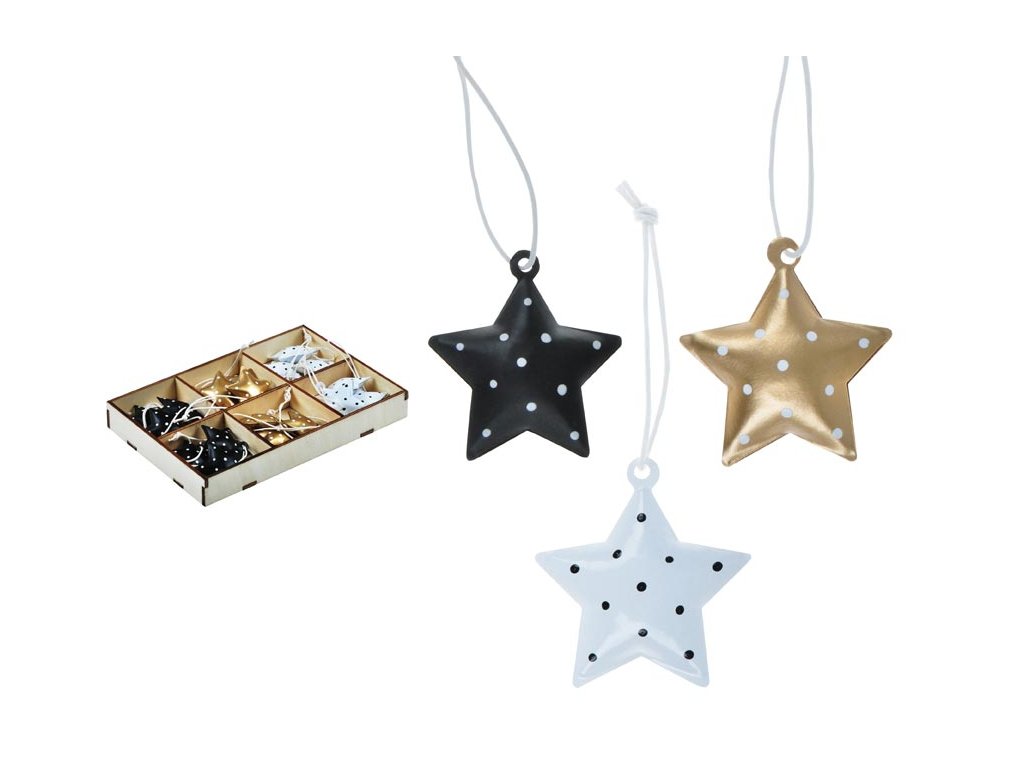 Súprava vianočných ozdôb 18 ks – Vianoce sú sviatky pohody a pokoja, preto je potrebné sa na ne poriadne pripraviť. Vyzdobte si domov touto krásnou dekoráciou, ktorá vám navodí pocit blížiacich sa Vianoc. Vianočné závesné ozdoby sú dokonalým doplnkom do každého interiéru. Táto vianočná ozdoba je opatrená očkom a šnúrkou na zavesenie. Môžete ju použiť na ozdobu vianočného stromčeka, zavesiť na dvere, na okno a skrášliť si tak vaše bývanie. SÚPRAVA OBSAHUJE: - 18 ks plechových hviezdičiek (čierne, zlaté, biele) Dodávame v drevenej škatuli. Uvedená cena je za 1 balenie.Dodatočné parametre