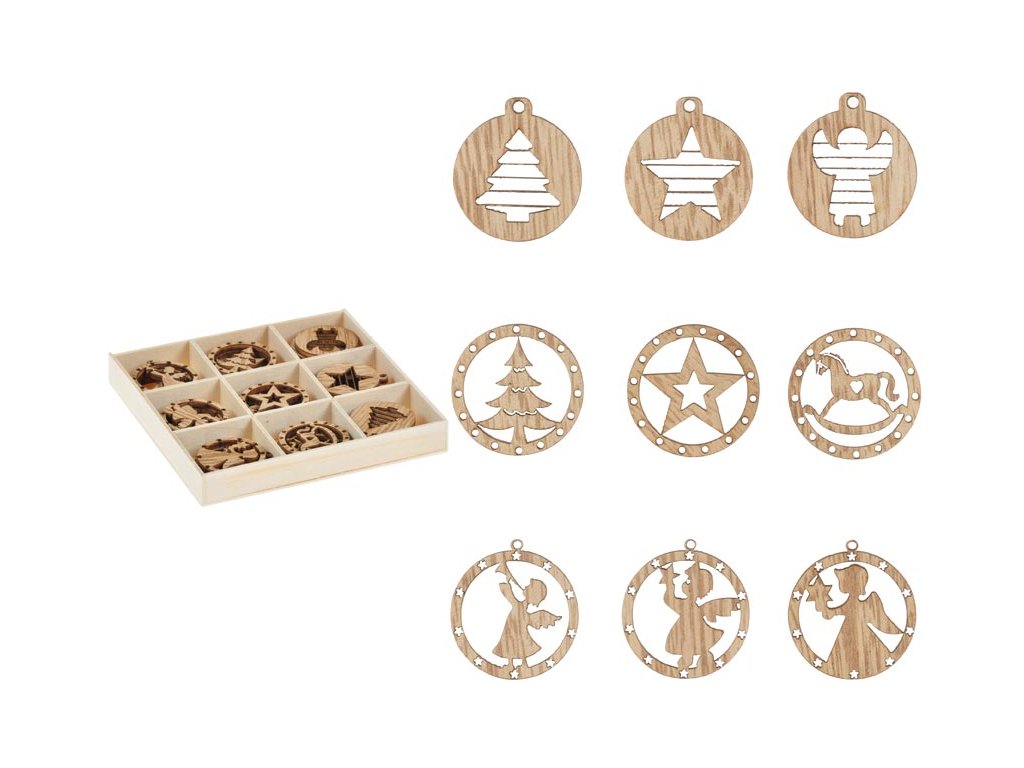 Vianočné drevené ozdoby. Vianoce sú sviatkami pohody a pokoja, a preto je potrebné sa na ne poriadne pripraviť. Vyzdobte si domov touto krásnou drevenou dekoráciou, ktorá Vám navodí pocit prichádzajúcich Vianoc. Môžete použiť na ozdobenie vianočného stromčeka, zavesiť na dvere, okno a skrášliť tak Vaše bývanie. SET OBSAHUJE: - 27 ks drevených ozdôb (anjeli, stromčeky, hojdací kôň, hviezdy) Rozmer: 30 x 30 mm Dodávame v drevenej krabičke. Uvedená cena je za 1 balenie.Dodatočné parametre