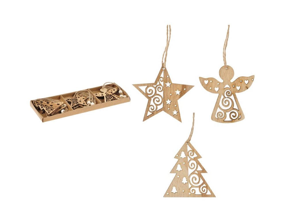 Vianočné drevené ozdoby 9 ks – Vianoce sú sviatky pohody a pokoja, preto je potrebné sa na ne poriadne pripraviť. Vyzdobte si domov touto krásnou drevenou dekoráciou, ktorá vám navodí pocit prichádzajúcich Vianoc. Každá vianočná ozdoba je opatrená šnúrkou na zavesenie. Môžete ju použiť na ozdobenie vianočného stromčeka, zavesiť na dvere, na okno a skrášliť tak svoje bývanie. SÚPRAVA OBSAHUJE: - 9 ks drevených ozdôb (hviezda, anjel, stromček) Dodávame v drevených priehradkách. Uvedená cena je za 1 balenie.Dodatočné parametre