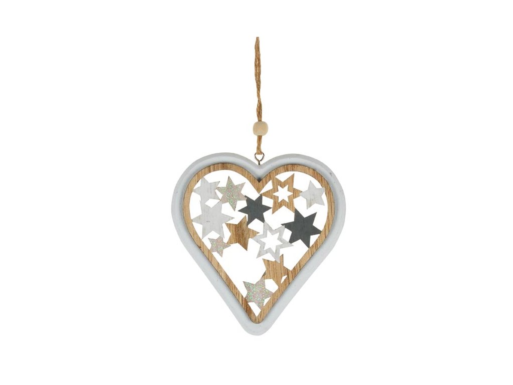 Štýlová drevená vianočná dekorácia v tvare srdca so závesom. Srdce je vyplnené malými hviezdičkami. Veľkosť 11 cm.Dodatočné parametre