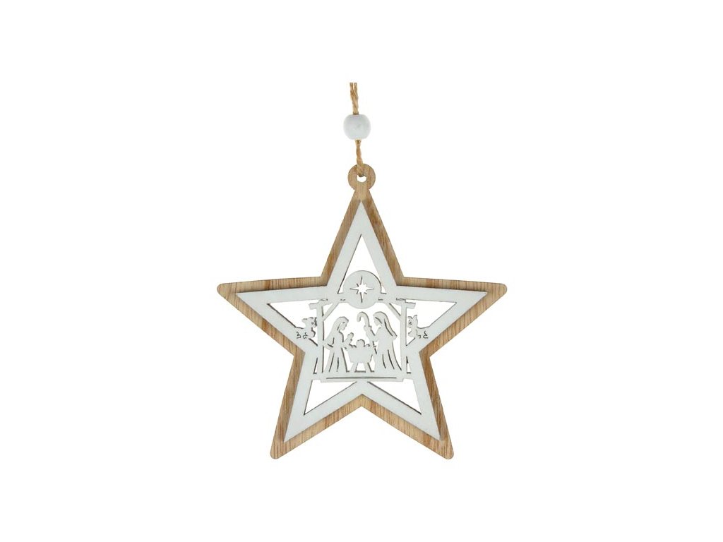 Drevená vianočná dekorácia v tvare hviezdy. Uprostred hviezdy je vyobrazenie Ježiška v kolíske.Dodatočné parametre