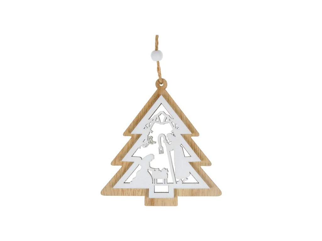 Drevená vianočná dekorácia v tvare vianočného stromčeka. Uprostred stromčeka je vyobrazenie Ježiška v kolíske.Dodatočné parametre