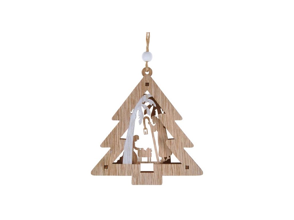 Drevená vianočná dekorácia 3D vianočný stromček. Uprostred je motív Ježiška v jasličkách s Jozefom a Máriou. Táto dekorácia je opatrená očkom a povrázkom s korálkou na zavesenie. Ideálna na zavesenie do okna alebo ako vianočná ozdoba. Veľkosť: 100 mm Uvedená cena je za 1 ks.Dodatočné parametre
