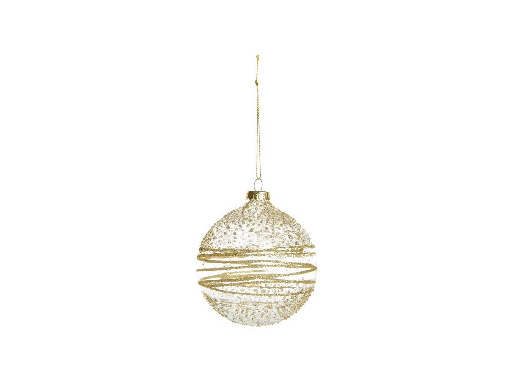 Číra, sklenená banka na vianočný stromček so zlatým dekorom. Táto vianočná ozdoba je ideálna ako výzdoba do interiérov. Banka je opatrená šnúrkou na zavesenie. Uvedená cena je za 1 ks.Dodatočné parametre