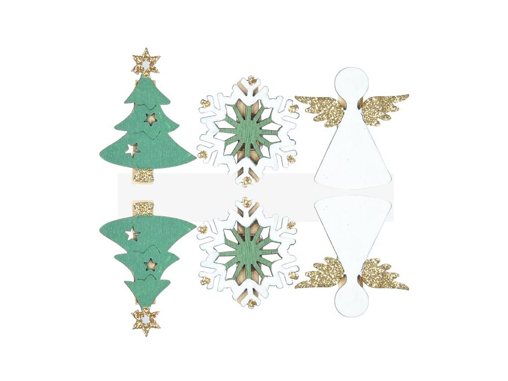 Vianočná, drevená dekorácia stromček, vločka a anjel nalepený na štipcu, ozdobí váš vianočný darček, blahoželanie alebo si ich môžete pripnúť kdekoľvek inde a ozdobiť si nimi interiér. Vyrobené z preglejky. BALENIE OBSAHUJE: - 6 ks štipcov (2 ks stromčekov, 2 ks snehových vločiek, 2 ks anjelikov) Uvedená cena je za 1 balenie.Dodatočné parametre