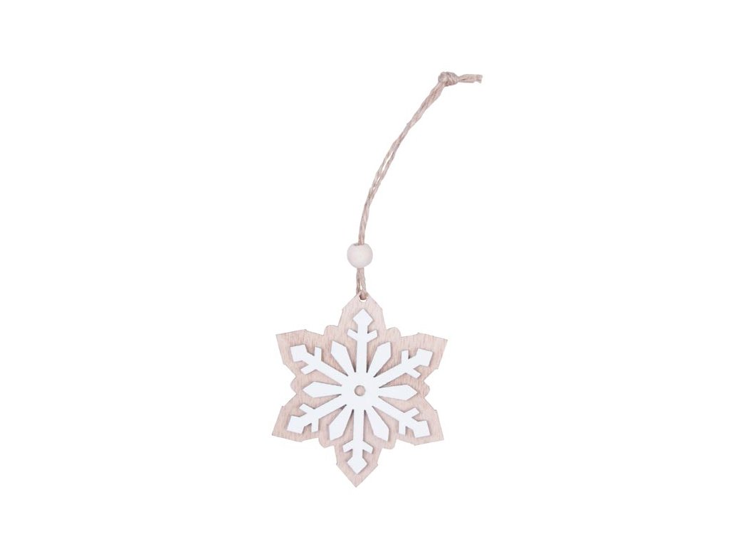 Vianočná drevená dekorácia snehová vločka na zavesenie. Krásna závesná snehová vločka je vybavená šnúrkou s korálkou na zavesenie. Môžete ju zavesiť na stromček, do okna alebo na dvere. Skrášli váš interiér a umocní vianočnú atmosféru. BALENIE OBSAHUJE: - 2 ks snehových vločiek Materiál: drevo Veľkosť: 70 mm Uvedená cena je za 1 balenie.Dodatočné parametre