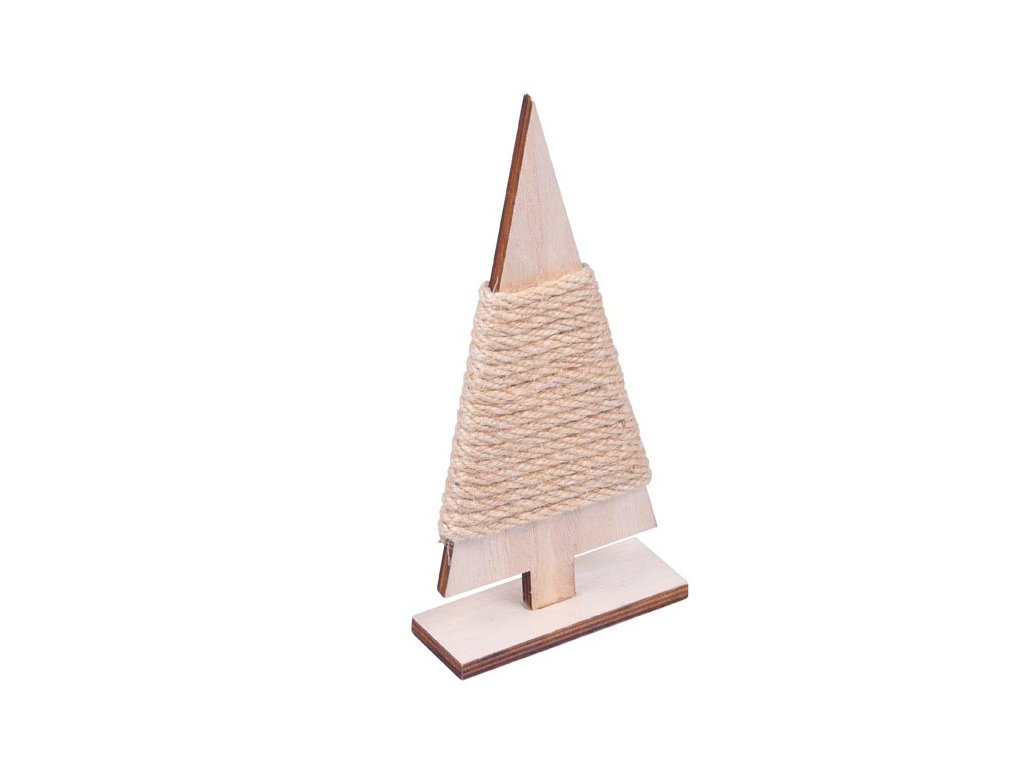 Vianočná drevená dekorácia stromček na podstavci. Stromček je ovinutý špagátom v prírodnej farbe. Vďaka podstavcu ho môžete postaviť kdekoľvek. Vytvorte si doma príjemnú vianočnú atmosféru a vyzdobte si domov touto krásnou a neotrelou dekoráciou. Materiál: drevo Veľkosť: 200 mm Uvedená cena je za 1 ks.Dodatočné parametre