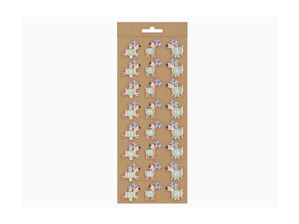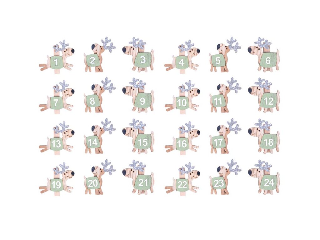 Drevené štipce so sobmi. Vytvorte si originálny adventný kalendár s drevenými štipcami so sobmi a číslami. Dodajú vám tú správnu vianočnú atmosféru. BALENIE OBSAHUJE: - 24 ks štipcov (sobov) Dodávame vo vrecku so závesom. Uvedená cena je za 1 balenie.Dodatočné parametre