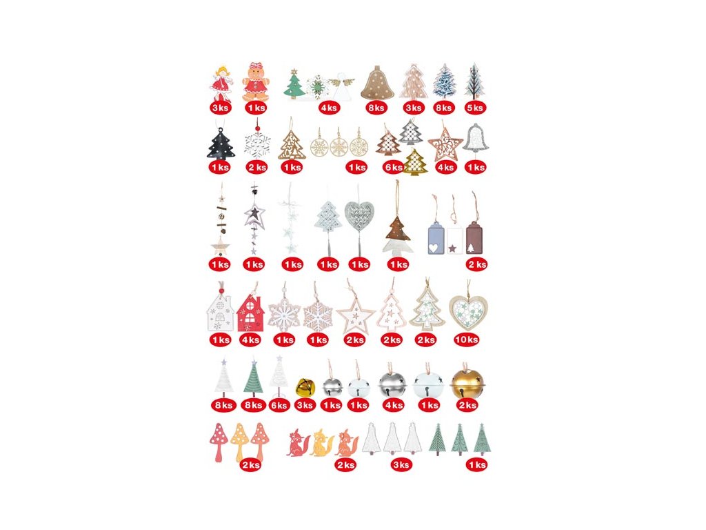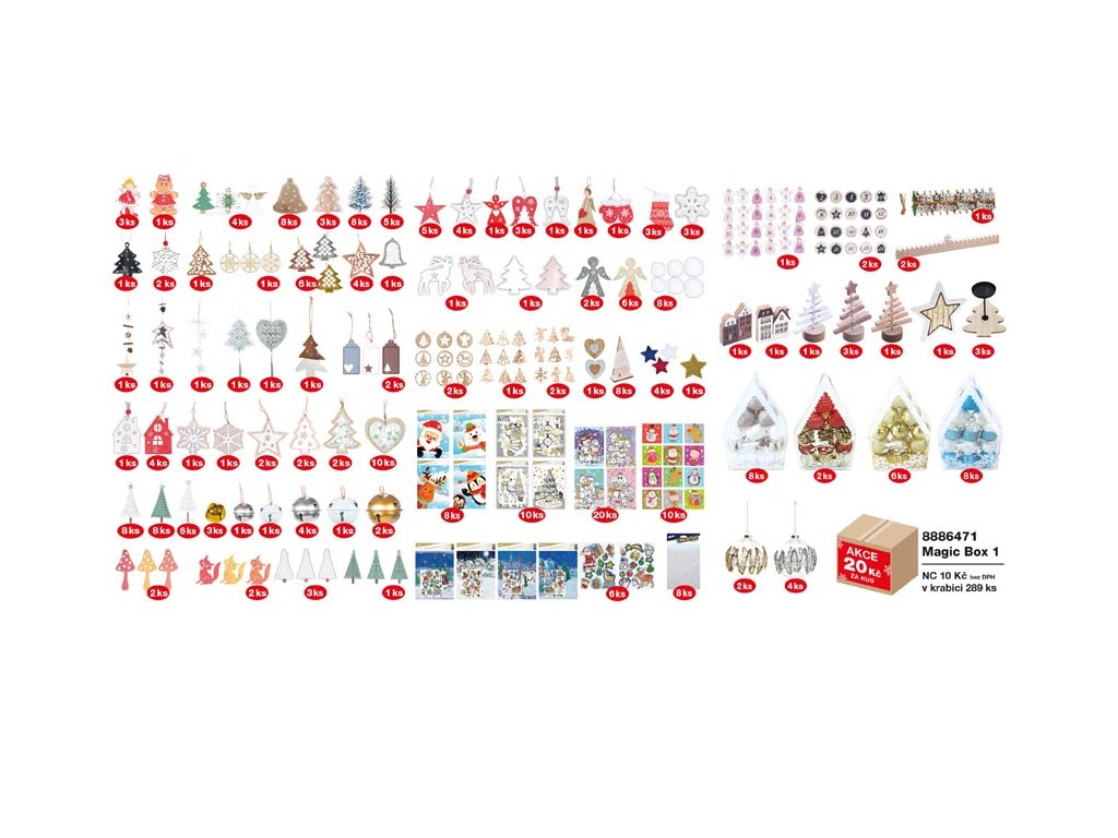Vianočný Magic BOX. Box obsahuje 264 ks rôznych vianočných ozdôb. Nájdete tu napr. vianočné ozdoby na zavesenie, postavenie ale aj na okno. Dekorácie sú z rôznych materiálov ako je drevo, plast, papier, kov, betón ai. Široká škála vianočných ozdôb zaručí, že budete mať všetko, čo potrebujete na výzdobu Vášho domova. V prípade vypredania niektorého z produktov môže byť nahradený iným. BALENIE OBSAHUJE: - 264 ks ozdôb Všetkých 264 ks je balených v kartónovej krabici. Dodávame iba ako celok 264 ks. Uvedená cena je za 1 ks.Dodatočné parametre