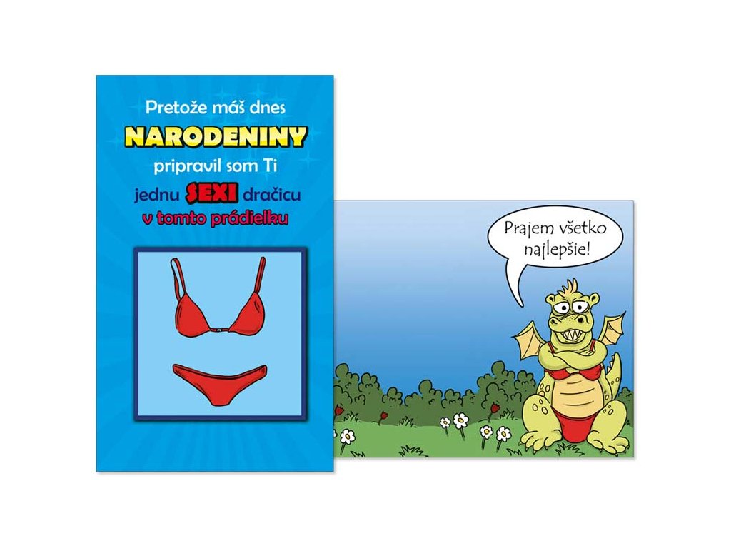Srdečné blahoželanie k narodeninám. Potešte oslávenca a spolu s darčekom mu venujte originálne a krásne prianie, ktoré mu bude pripomínať túto radostnú udalosť. Text na prednej strane: Pretože máš dnes narodeniny pripravil som Ti jednu sexi dračicu v tomto prádielku. Text vo vnútri blahoželania: Prajem všetko najlepšie! Rozmery: 114 x 190 mm Papier: pohľadnicový kartón 240 g Želanie ja balené vo vrecúšku, súčasťou balenia je listová obálka. Uvedená cena je za 1 ks.Dodatočné parametre
