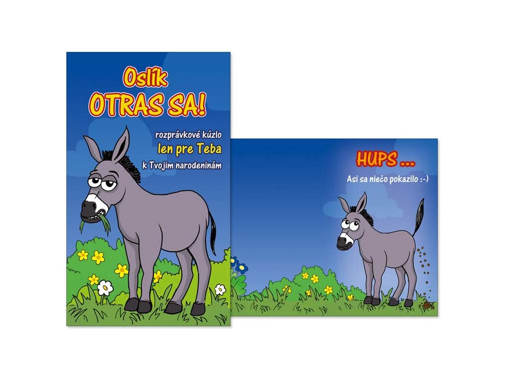 Srdečné blahoželanie k narodeninám. Potešte oslávenca a spolu s darčekom mu venujte originálne a krásne prianie, ktoré mu bude pripomínať túto radostnú udalosť. Text na prednej strane: Oslík, otras sa! Rozprávkové kúzlo len pre teba k Tvojim narodeninám Text vo vnútri blahoželania: HUPS ... Asi sa niečo pokazilo? Rozmery: 114 x 190 mm Papier: pohľadnicový kartón 240 g Želanie ja balené vo vrecúšku, súčasťou balenia je listová obálka. Uvedená cena je za 1 ks.Dodatočné parametre