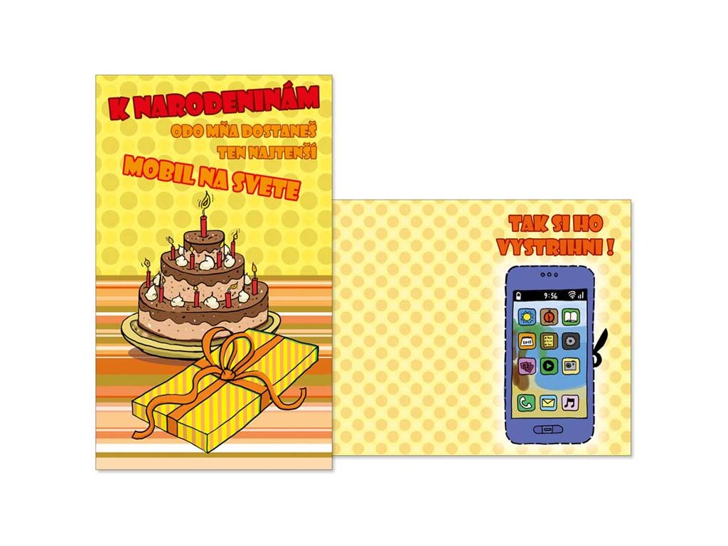 Srdečné blahoželanie k narodeninám. Potešte oslávenca a spolu s darčekom mu venujte originálne a krásne prianie, ktoré mu bude pripomínať túto radostnú udalosť. Text na prednej strane: K narodeninám odo mňa dostaneš ten najtenší mobil na svete Text vo vnútri blahoželania: Tak si ho vystrihni! Rozmery: 114 x 190 mm Papier: pohľadnicový kartón 240 g Želanie ja balené vo vrecúšku, súčasťou balenia je listová obálka. Uvedená cena je za 1 ks.Dodatočné parametre
