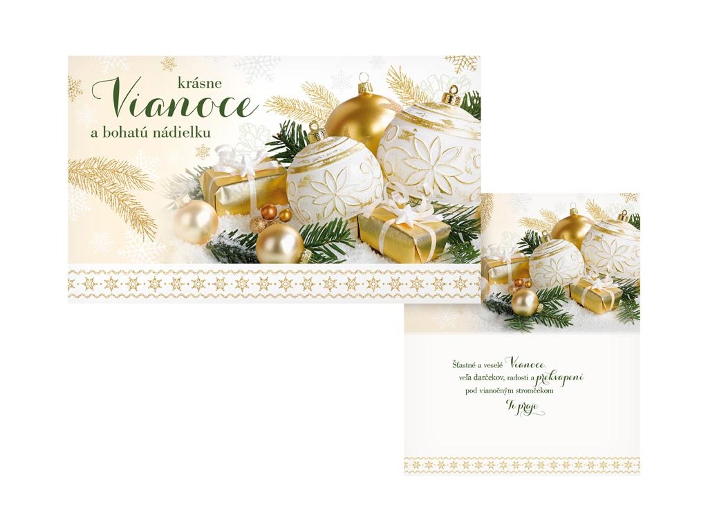 Vianočné blahoželanie s textom. Nezabudnite poslať krásne Vianočné prianie Vašim známym. Určite ich poteší to, že ste si na ne spomenuli. Text na prednej strane: Krásne Vianoce a bohatú nádielku Text vo vnútri priania: Šťastné a veselé Vianoce a veľa darčekov, radosti a prekvapení pod vianočným stromčekom Ti praje Papier: pohľadnicový kartón 240 g Prianie je balené v sáčku, súčasťou balenia je aj listová obálka. Uvedená cena je za 1 ks.Dodatočné parametre