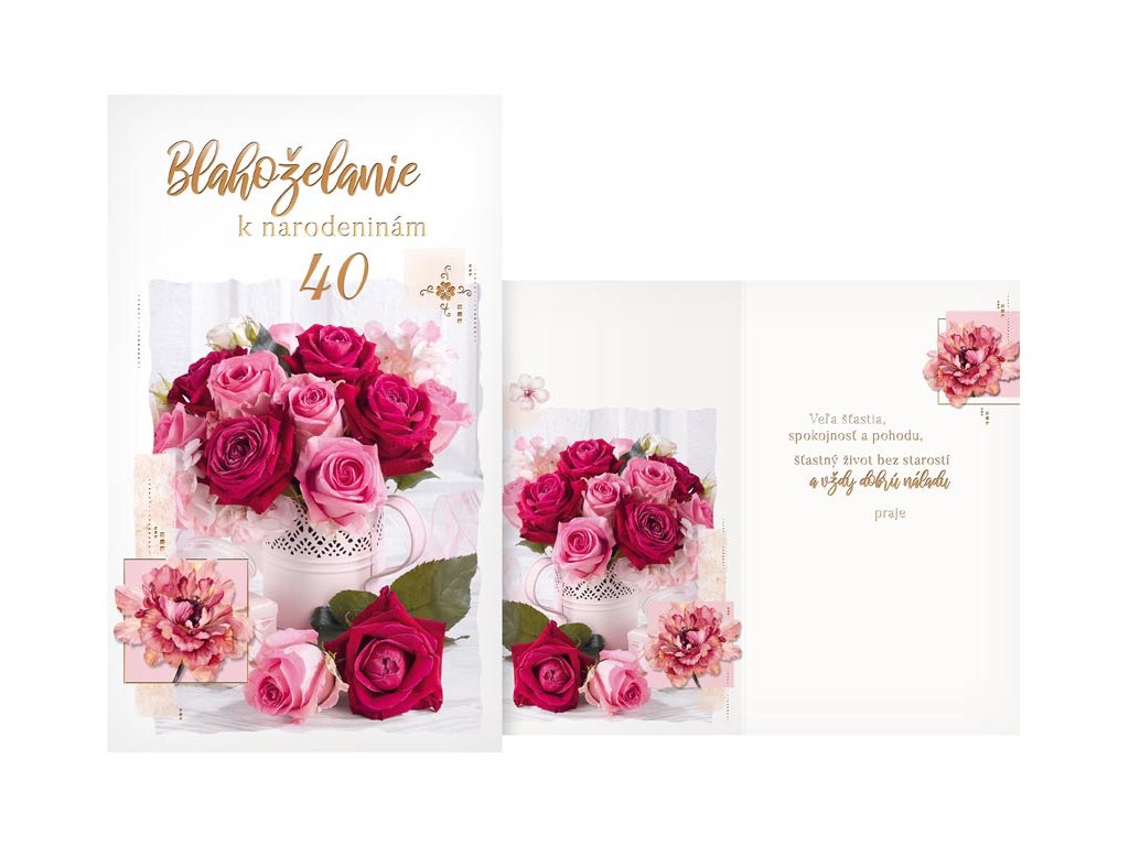 Blahoželanie k 40. narodeninám s obrázkom kytice ruží. Oslavy narodenín patria k výnimočným a príjemným okamihom v živote. Potešte oslávenca a spolu s darčekom mu venujte originálne a krásne prianie, ktoré mu bude pripomínať túto radostnú udalosť. Text na prednej strane: Blahoželanie k narodeninám 40 Text vo vnútri priania: Veľa šťastia, pevné zdravie, spokojnosť a pohodu, šťastný život bez starostí a vždy dobrú náladu praje Papier: pohľadnicový kartón Prianie je balené v sáčku, súčasťou balenia je aj listová obálka. Uvedená cena je za 1 ks.Dodatočné parametre