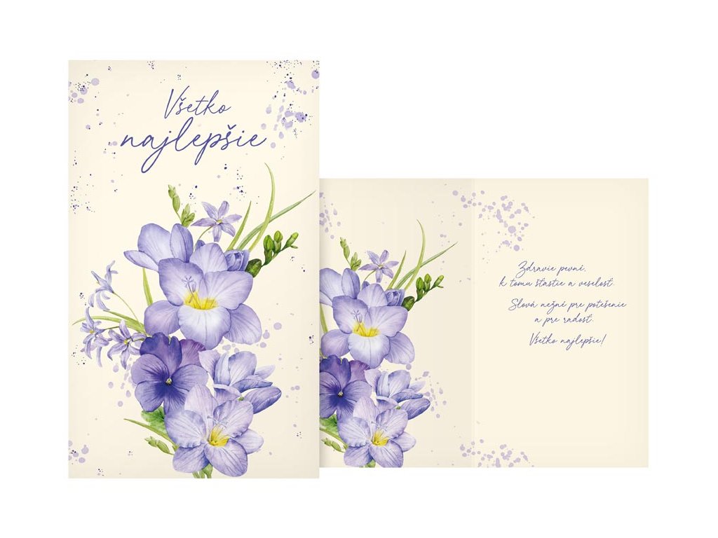 Srdečné blahoželanie k narodeninám alebo meninám s obrázkom kvetín. Potešte oslávenca a venujte mu srdečné blahoželanie. Text na prednej strane blahoželania: Všetko najlepšie Text vo vnútri blahoželania: Zdravie pevné, k tomu šťastie a veselosť. Slová nežné pre potešenie a pre radosť. Všetko najlepšie! Papier: pohľadnicový kartón 240 g Blahoželanie je v obale, súčasťou balenia je i listová obálka. Uvedená cena je za 1 ks.Dodatočné parametre