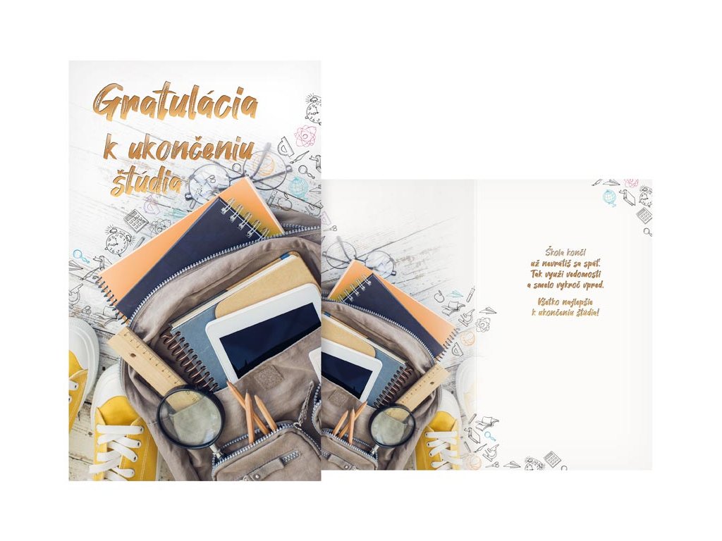 Prianie na ukončenie štúdia s textom. Oslavy ukončenia štúdia patria k výnimočným a príjemným okamihom v živote. Venujte originálne a krásne prianie, ktoré bude pripomínať tento životný míľnik. Text na prednej strane: Gratulácia k ukončeniu štúdia Text vo vnútri priania: Škola končí už nevrátiš sa späť. Tak využi vedomosti a smelo vykroč vpred. Všetko najlepšie k ukončeniu štúdia! Papier: pohľadnicový kartón Prianie je balené v sáčku, súčasťou balenia je aj listová obálka. Uvedená cena je za 1 ks.Dodatočné parametre