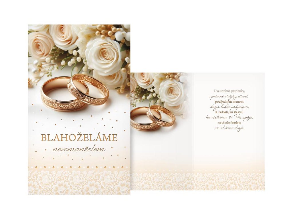Snubné prstene – symbol večnej lásky a oddanosti. Keď si dvaja ľudia sľúbia lásku na celý život, je to okamih plný emócií, nádeje a krásnych začiatkov. Doprajte im prianie, ktoré vystihne ich výnimočný deň a stane sa nezabudnuteľnou spomienkou na ich spoločnú cestu. Text na prednej strane: Blahoželáme novomanželom Text vo vnútri priania: Dva snubné prstienky, úprimné dotyky dlaní, pod jedným menom dvaja ľudia podpísaní. K radosti, ku šťastiu, ku všetkému, čo Vás spája, na všetko budete už od teraz dvaja. Papier: pohľadnicový kartón 240 g Prianie je balené v sáčku, súčasťou balenia je aj listová obálka. Uvedená cena je za 1 ks.Dodatočné parametre