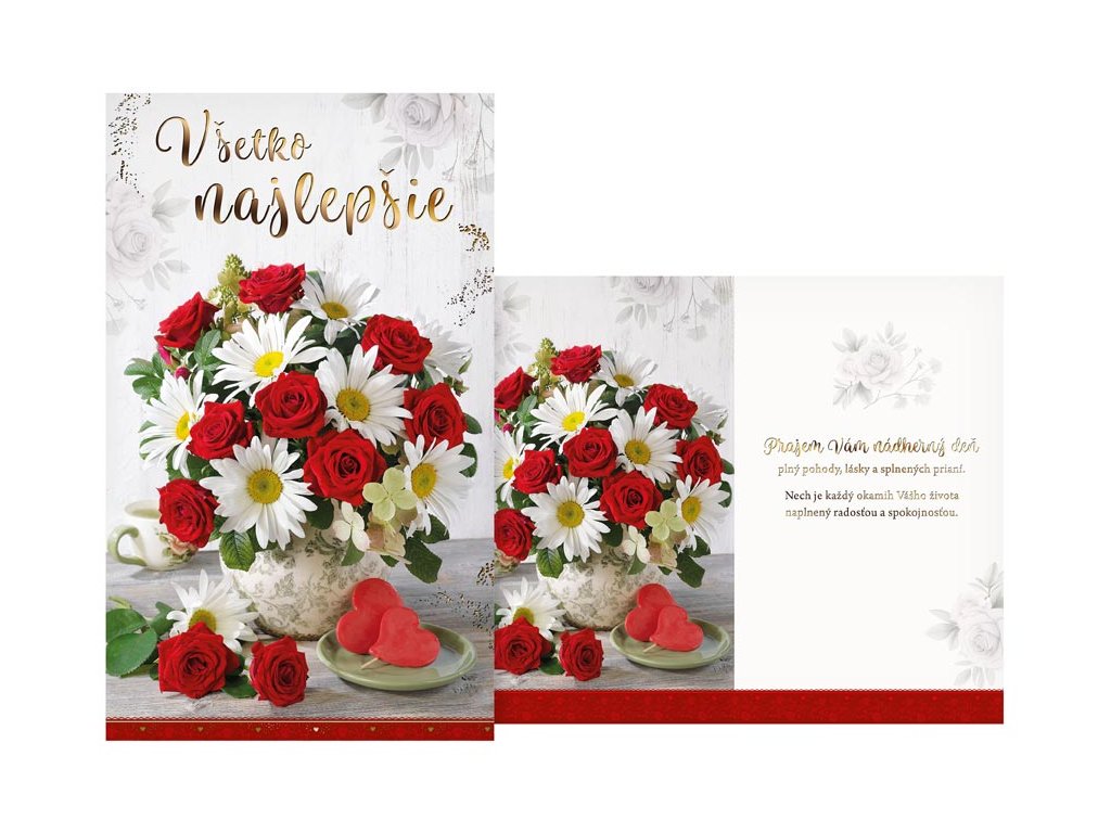 Narodeniny sú výnimočným dňom plným radosti, úsmevov a krásnych prianí. Blahoželanie k narodeninám prináša eleganciu a srdečnosť v podobe nádhernej kytice červených ruží a bielych margarét – kvetov symbolizujúcich lásku, šťastie a pohodu. Krásny spôsob, ako vyjadriť svoju náklonnosť a potešiť blízkeho človeka v jeho veľký deň. Text na prednej strane: Všetko najlepšie Text vo vnútri priania: Prajem Vám nádherný deň plný pohody, lásky a splnených prianí. Nech je každý okamih Vášho života naplnený radosťou a spokojnosťou. Papier: pohľadnicový kartón Prianie je balené v sáčku, súčasťou balenia je aj listová obálka. Uvedená cena je za 1 ks.Dodatočné parametre